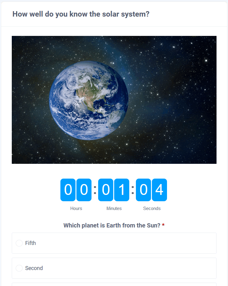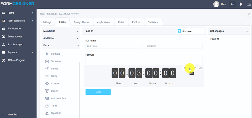 You have probably met the extra element "Timer" many times on the pages of the site when conducting various promotions and making an order. Using this form element, you can additionally encourage the user to fill out the form. You can also use a timer in creating all kinds of online tests, where users need to answer the questions asked and for each correct answer, the user is awarded a certain score, the sum of which is one or another result is output. To add the "Timer" element to the form, you need to click on the selected item or drag it to the right, then you will see the added element on the right: