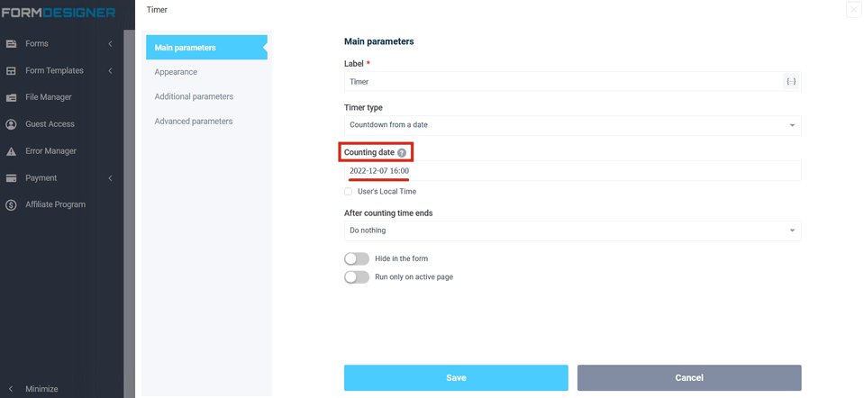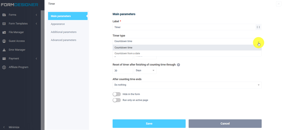 In the "Timer type" field, two options are currently available: countdown and countdown to date: