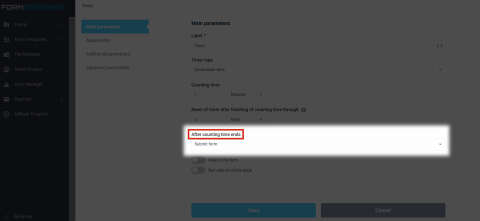 If you chose the second option, then you need to specify the page address, if you chose "Lock form", then when you click on the submit form button, a message will be displayed that the time is up and the form is blocked. If you just need to hide or display any element of the form after the end of the countdown, then select the first option "Do nothing" and use the logical rules for the form elements.