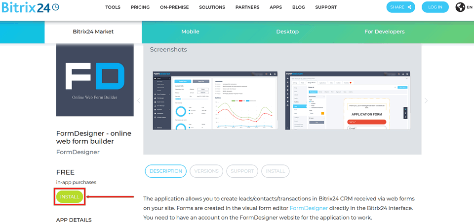 Clicking on the above link will open a window with the Bitrix24 application. Click Install on the bottom left, under the Formdesigner logo and description: