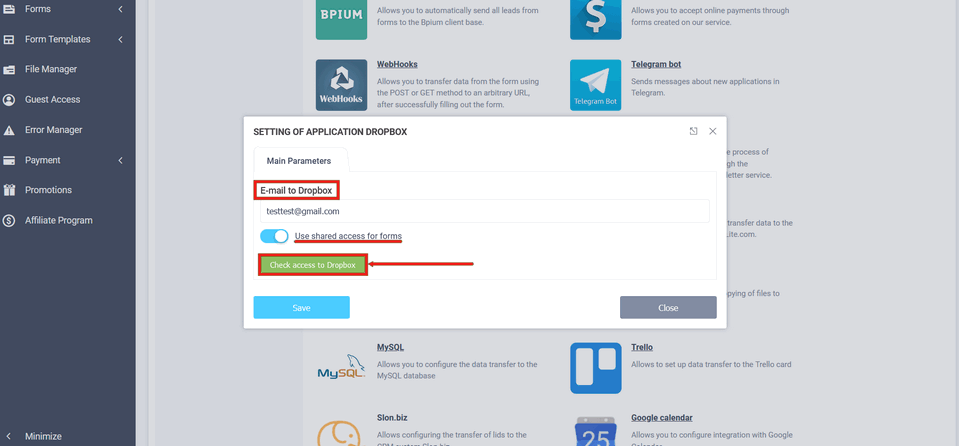 Next, if you have set up a module for one form and will integrate the module with other forms, you do not have to re-log in to Dropbox, just enter your e-mail, activate the switch "Use shared access for forms" and click "Check access to Dropbox":