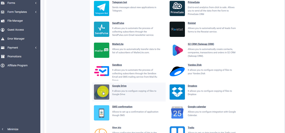 And you'll be immediately taken to the "Google Drive" integration module settings for the selected form.