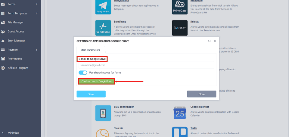 Further, if you have configured a module for one form and you are going to integrate the module with other forms, you not obligatory to authorize in Google Drive again, you only have to input your e-mail, check "Use sharing form(s)" option. "Use Forms Sharing switch and click Check Access to Google Drive: