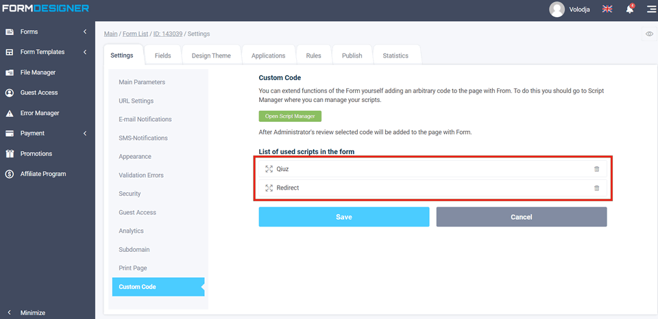 Today we have another update. We have improved our script manager added the ability to connect not one arbitrary code to the form, but several and set the order of loading them.
